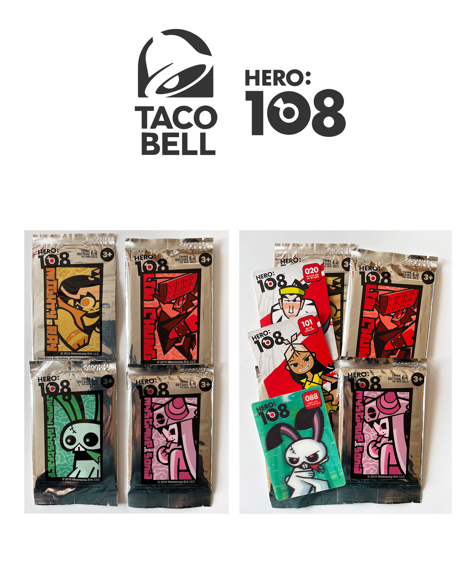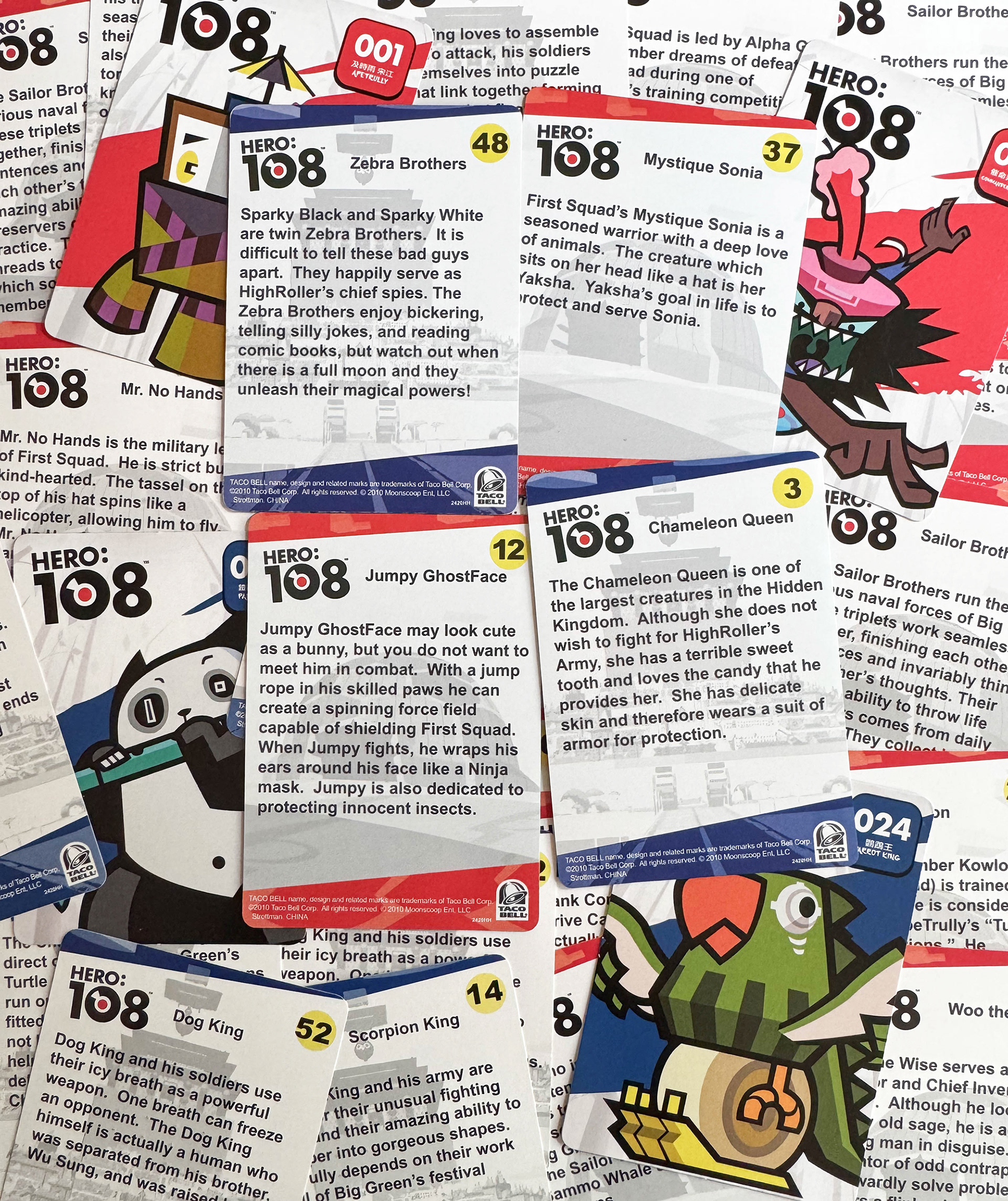 Hero 108 collectible trading cards, with special lenticular cards, and packaging design for Taco Bell